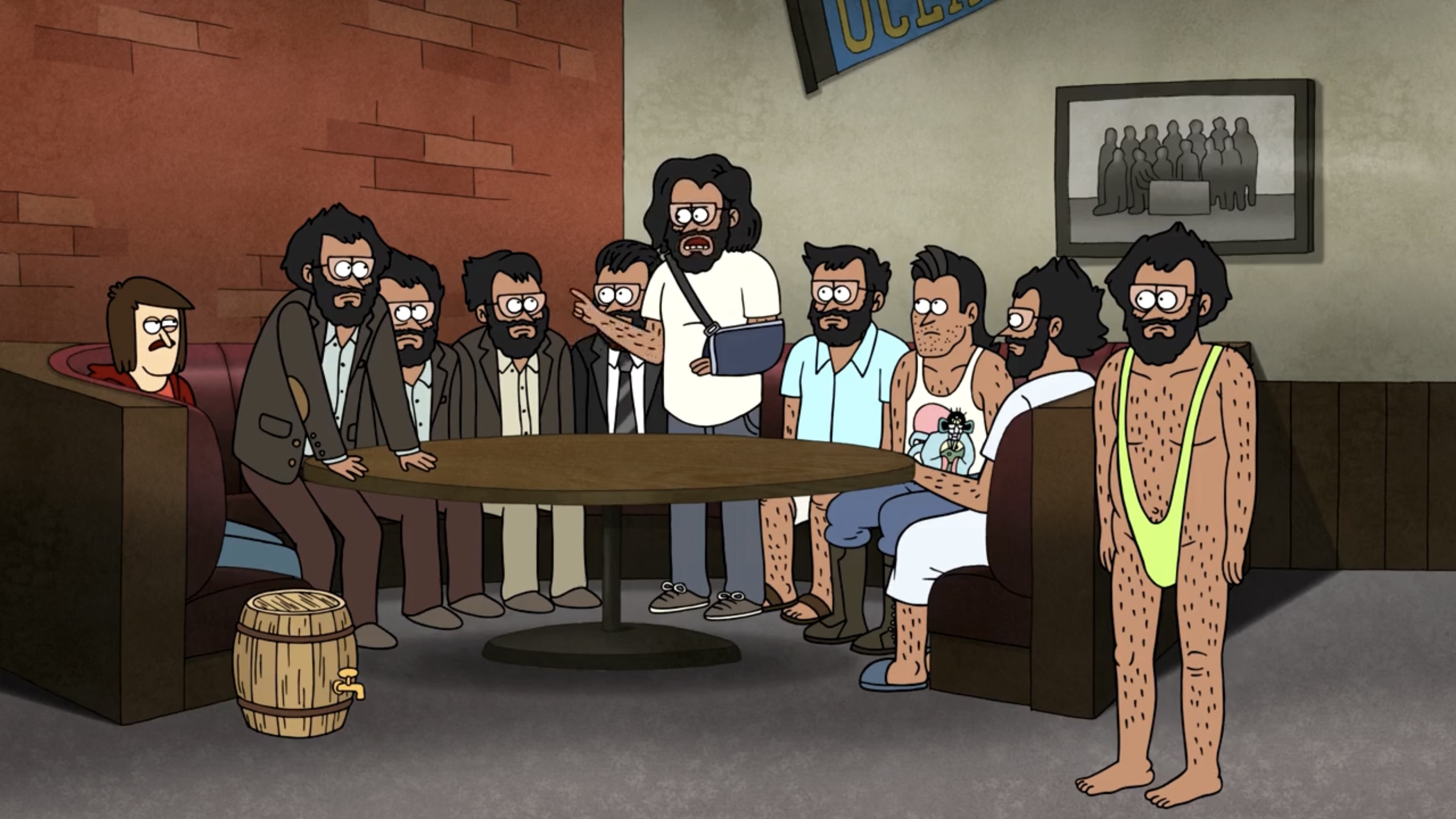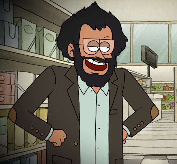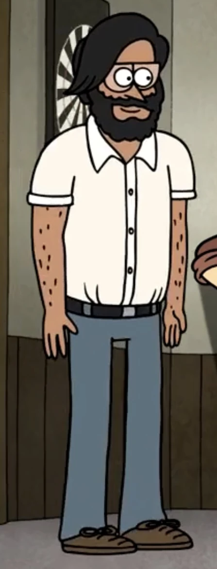 Alex is a human man in his 30s. His ethnicity is unknown (possibly Greek). He is the tallest out of the main characters and has a pot belly. Alex has a light brown skin tone, shaggy black hair and a beard, and u-framed glasses. He wears a charcoal-grey sport coat with brown elbow patches over a light teal dress shirt, brown pants, a black belt with a bronze-coloured buckle, and greyish-brown shoes.