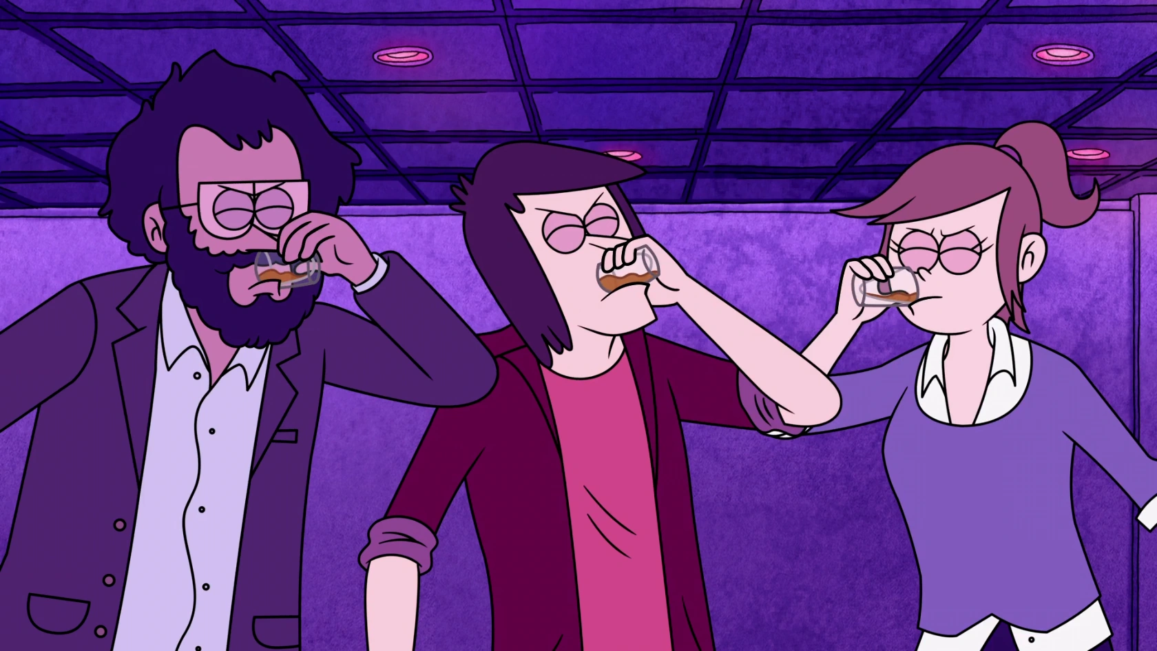 As this happens, a glaringly out of age and out of trend man named Davey Wegman walks up to the bar. Noticing how old he looks and acts, the barkeeper asks to see Davey's ID, to which he complies. After finding out that Davey is indeed well over 30, the barkeeper announces they have a VIP, and robes and leads him to a chair, where he starts levitating to the ceiling. Josh, Emily, and Alex watching in awe quickly turns into horror as Davey is actually being sucked into a giant ceiling fan and is executed, with the reveal that VIP means "Very Irrelevant Person" and it happens to anyone in the bar who’s over 30.