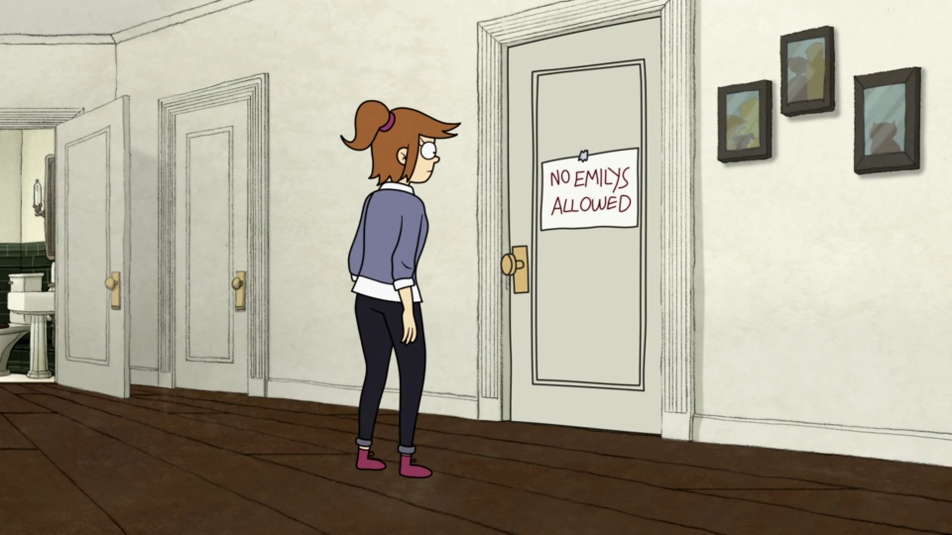 At Camomile Elementary, Emily, who is thought to be a new student by Mr. Campbell, introduces herself to the class, but her awkward behavior of trying to relate to young children, including saying moms are great and sticking a pencil in her ear, makes everyone call her “weird kid”, they even been chanting it as she sits down.